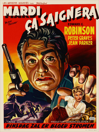 BLACK TUESDAY (1954): This brutal and breakneck hostage yarn is powered by arguably Edward G. Robinson’s most vicious performance. Gangster Vince Canelli (Eddie G.) makes a daring prison break on the day of his scheduled execution, holing up in a hideout with a group of horrified hostages. Who will survive? That’s pretty much it for the plot, but Fregonese’s vigorous direction and stark camerawork courtesy of the great Stanley Cortez (The Magnificent Ambersons), abet Robinson as he chews apart the scenery and his fellow cast members. One of Hollywood’s most refined gentlemen, Robinson had bid farewell to his snarling persona after Key Largo (1948), but his “gray listing” in the wake of the HUAC hearings led him to accept this role—in which he vents several years of anger and frustration. The harsh violence and bleak tone actually led to Black Tuesday being banned in certain parts of the country. Dir. Hugo Fregonese