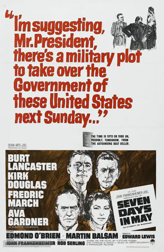 SEVEN DAYS IN MAY (1964): When a military officer (Kirk Douglas) discovers a coup is being plotted by one of the Joint Chiefs of Staff (Burt Lancaster), the President of the United States (Fredric March) must try to find a way to dismantle it. it received two nominations at the 37th Academy Awards (1965): Best Supporting Actor (Edmond O'Brien) and Best Art Direction-Set Decoration, Black-and-White (Cary Odell, Edward G. Boyle). Dir: John Frankenheimer