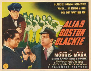 ALIAS BOSTON BLACKIE (1942): Reformed thief Boston Blackie (Chester Morris) helps present a charity Christmas show for New York prison inmates, but things go haywire when a wrongly convicted con (Larry Parks) uses the troupe to aid in his bust-out. Blackie frantically outraces the cops to recapture the con and spare him a bad end. This breathless combination of mystery, comedy, and action is perhaps the best offering in Columbia's long-running "Boston Blackie" series, one of the most popular "B" serials of all-time. Dir. Lew Landers