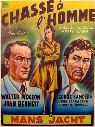 MAN HUNT (1941): In this suspenseful noir based on Geoffrey Household's `939 novel Rogue Male, the Gestapo hunts down a sportsman (Walter Pidgeon) after he accidentally stumbles across Hitler's secret residence. He finds an unlikely ally in a lovely Cockney girl (Joan Bennett).Dir. Fritz Lang
